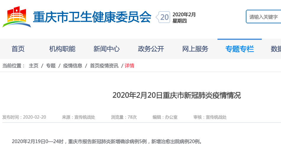 荔枝新闻讯 2020年2月19日0—24时,重庆市报告新冠肺炎新增确诊病例5例,新增治愈出院病例20例。