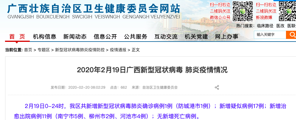 荔枝新闻讯 据广西卫健委网站消息,2月19日0-24时,广西共新增新型冠状病毒肺炎确诊病例1例(防城港市1例);新增疑似病例17例;新增治愈出院病例11例(南宁市5例、柳州市2例、河池市4例);无新增死亡病例。