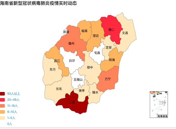 截至2月19日24时,海南省累计报告新冠肺炎确诊病例168例,重症病例9例,死亡病例4例,出院病例84例。确诊病例中,海口市39例、三亚市54例、儋州市15例、文昌市3例、琼海市6例、万宁市13例、东方市3例、澄迈县9例、临高县6例、昌江县7例、陵水县4例、定安县3例、保亭县3例、乐东县2例、琼中县1例。