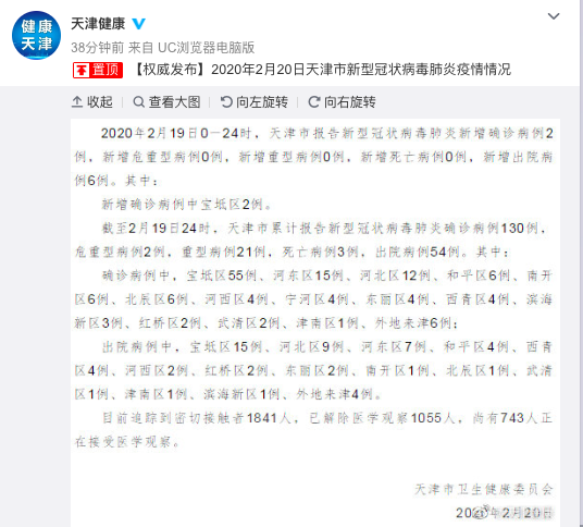 截至2月19日24时,天津市累计报告新型冠状病毒肺炎确诊病例130例,危重型病例2例,重型病例21例,死亡病例3例,出院病例54例。其中: