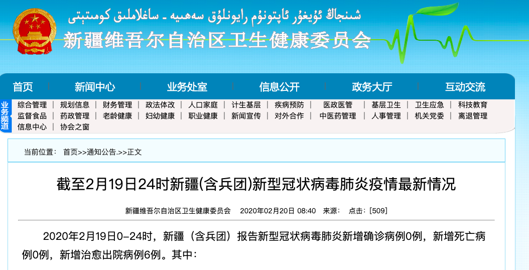 荔枝新闻讯 2020年2月19日0-24时,新疆(含兵团)报告新型冠状病毒肺炎新增确诊病例0例,新增死亡病例0例,新增治愈出院病例6例。其中: