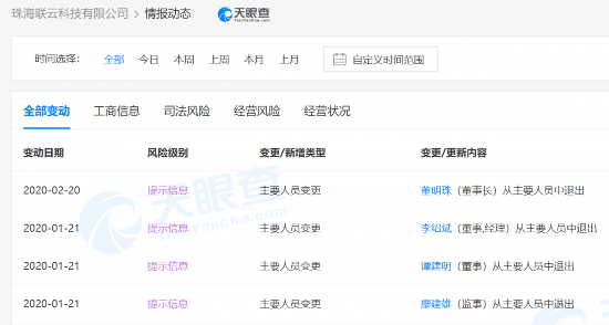 天眼查数据显示,2月20日,珠海联云科技有限公司发生人员变动,董明珠退出董事长一职。目前,董明珠仍为该企业法定代表人。
