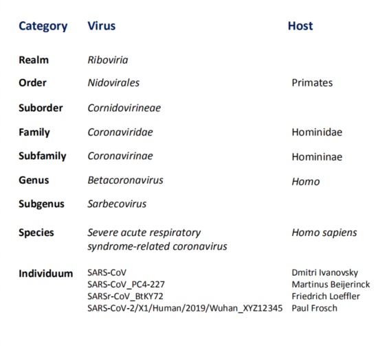 冠状病毒研究小组的论文提出,从分类学上讲,新型冠状病毒仅仅是SARS相关冠状病毒中的一种病毒。冠状病毒研究小组认为,这和21世纪以来发生在人类身上的两种人畜共患的冠状病毒SRAS病毒和MERS病毒不同,当时这两个病毒是新发现的,与原先发现的冠状病毒都不同。