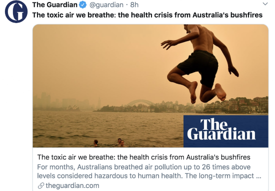 澳大利亚国立大学急诊科医生David Caldicott对《卫报》表示,“急诊科内出现了许多患有哮喘的孩子,他们的父母都很焦虑。山火浓烟甚至导致了核磁共振扫描仪停止工作”。新南威尔士大学气候变化研究中心的副教授格林(Donna Green)指出,:“目前,我们处在一个巨大的实验当中。我们知道气候变化会带来很糟糕的影响,但是不知道会有多糟糕”。