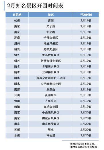 2月20日,携程全球玩乐平台发布了首批“知名景区开放时间表”,根据景区公布的信息,包括杭州西湖;南京夫子庙、玄武湖;济南千佛山景区、绍兴柯岩风景区、鲁迅故里景区;浙江丽水古堰画乡景区、云和梯田景区;江西鹰潭龙虎山;苏州周庄;浙江台州神仙居等20多家知名景区已于2月20日前开园。