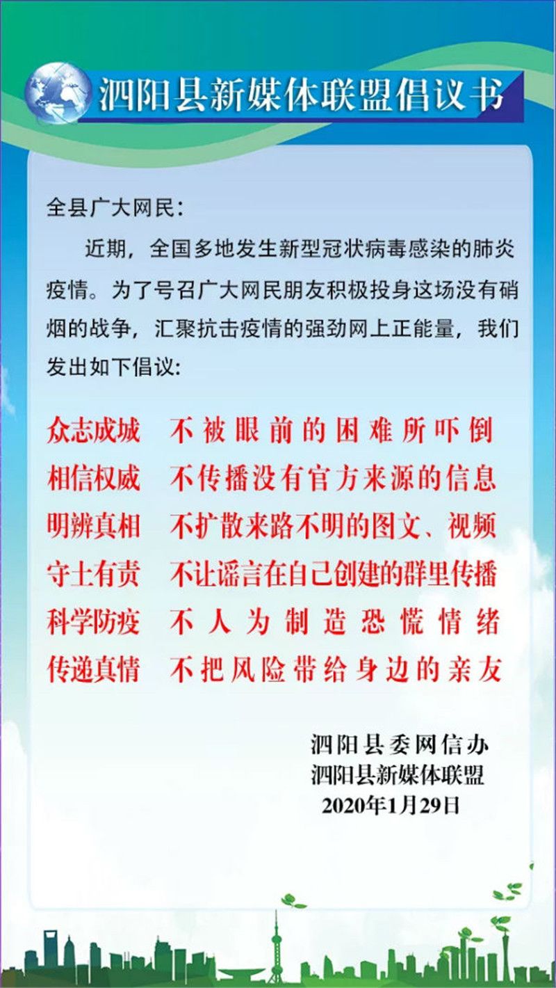 早在1月29日,泗阳县委网信办、泗阳县新媒体联盟就向全县网民发出电子倡议书,号召大家在特殊时期携手共进、攻克时艰,以实际行动抗击疫情、守护家园。倡议书发出后,泗阳网友们纷纷在微信朋友圈转发响应,以身作则,营造了良好的网络“防疫”氛围。
