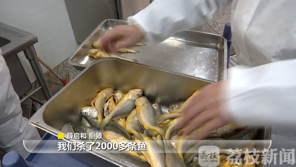 荔枝特报记者贾威在武汉轻工大学梅花餐厅食堂看到,星夜到达的厨师们已经忙活开了。厨师薛启和告诉贾威,为了卸下将近20吨的食材,他们8个人从晚上8点半一直忙活到凌晨4点半,还处理了2000多条鱼,当夜就睡了两个小时。