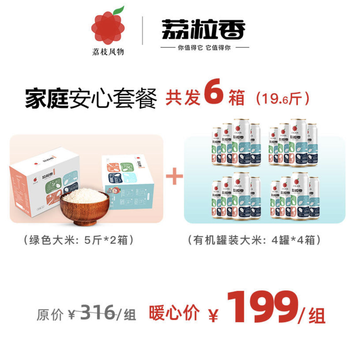 作为惠民平台,我们的菜品在保证质量的基础上,给大家最大力度的优惠,只为了给你最贴心的服务!江苏广电旗下荔枝风物·荔粒香大米此次也给出了超惠折扣:原价316元的家庭安心套餐,包含2箱绿色五斤装大米和4箱共计16罐有机大米,现在仅需199元。