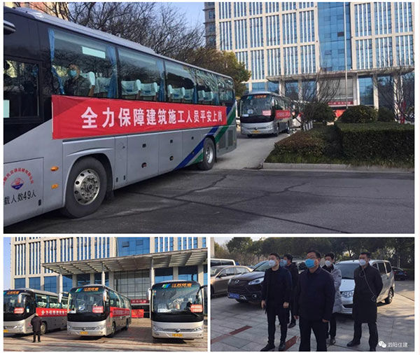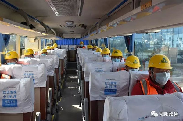 2月20日上午,建筑施工人员接送专用车从泗阳出发,前往连云港灌云县接工人返泗复工。