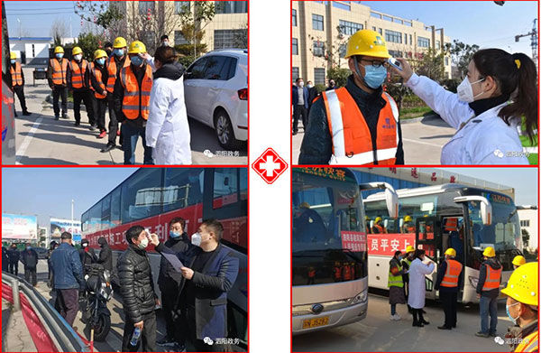 接送专用车到达施工人员所在地后,工作人员立即对工人们进行信息核对,每一位工人在测量体温及消毒后陆续上车,准备返回泗阳。
