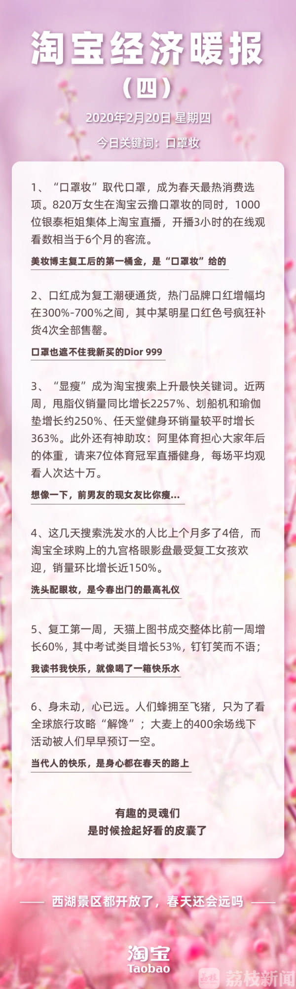 睡衣的销量终于下降,口红重新开始脱销,820万人上淘宝直播“云撸妆”,线下艺术展、旅游攻略的关注度悄然攀升……2月19日的《淘宝经济暖报》透露出了人们蠢蠢欲动的小心思。