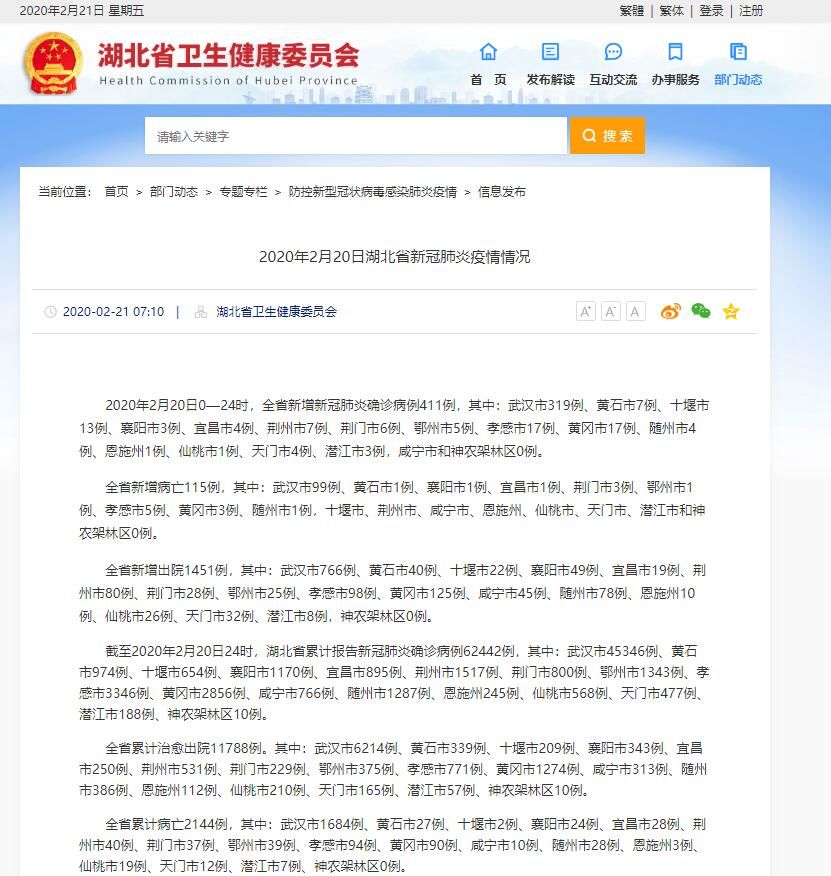 截至2020年2月20日24时,湖北省累计报告新冠肺炎确诊病例62442例,其中:武汉市45346例、黄石市974例、十堰市654例、襄阳市1170例、宜昌市895例、荆州市1517例、荆门市800例、鄂州市1343例、孝感市3346例、黄冈市2856例、咸宁市766例、随州市1287例、恩施州245例、仙桃市568例、天门市477例、潜江市188例、神农架林区10例。