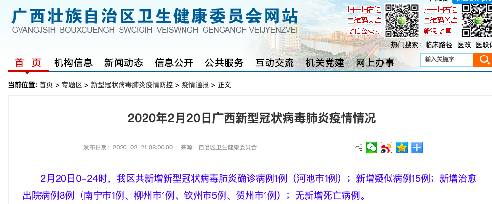 荔枝新闻讯 2月20日0—24时,广西新增新型冠状病毒肺炎确诊病例1例(河池市1例);新增疑似病例15例;新增治愈出院病例8例(南宁市1例、柳州市1例、钦州市5例、贺州市1例);无新增死亡病例。