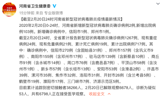 荔枝新闻讯 2020年2月20日0—24时,河南省新增新型冠状病毒肺炎确诊病例2例,新增出院病例103例。新增确诊病例中,信阳市1例、郑州市1例。