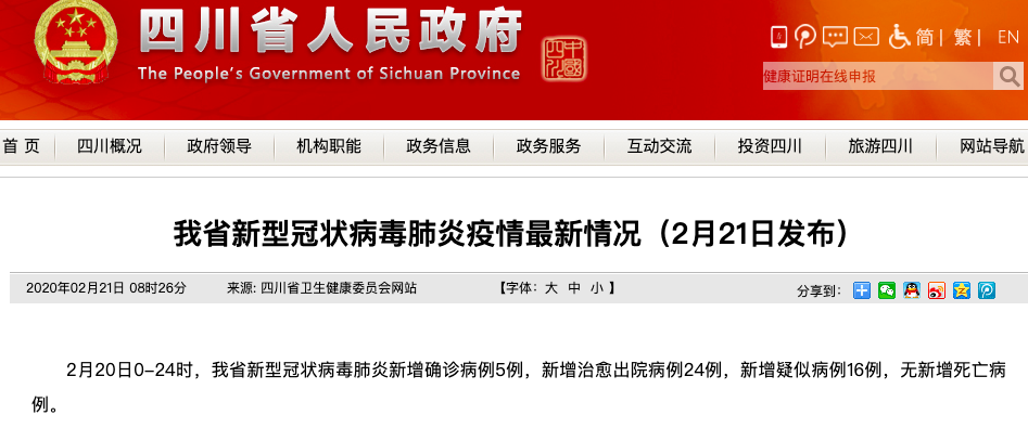 荔枝新闻讯 2月20日0—24时,四川省新型冠状病毒肺炎新增确诊病例5例,新增治愈出院病例24例,新增疑似病例16例,无新增死亡病例。