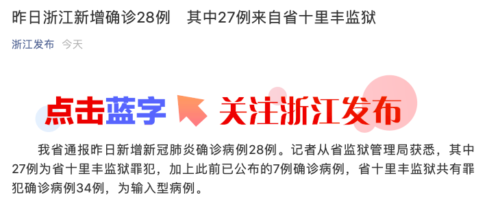 荔枝新闻讯 据浙江发布消息,浙江省通报昨日新增新冠肺炎确诊病例28例。其中27例为省十里丰监狱罪犯,加上此前已公布的7例确诊病例,省十里丰监狱共有罪犯确诊病例34例,为输入型病例。