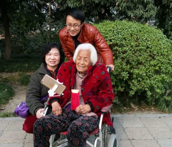 2017年,牟炳贞(前)与孙儿及叶开敏在成都合影