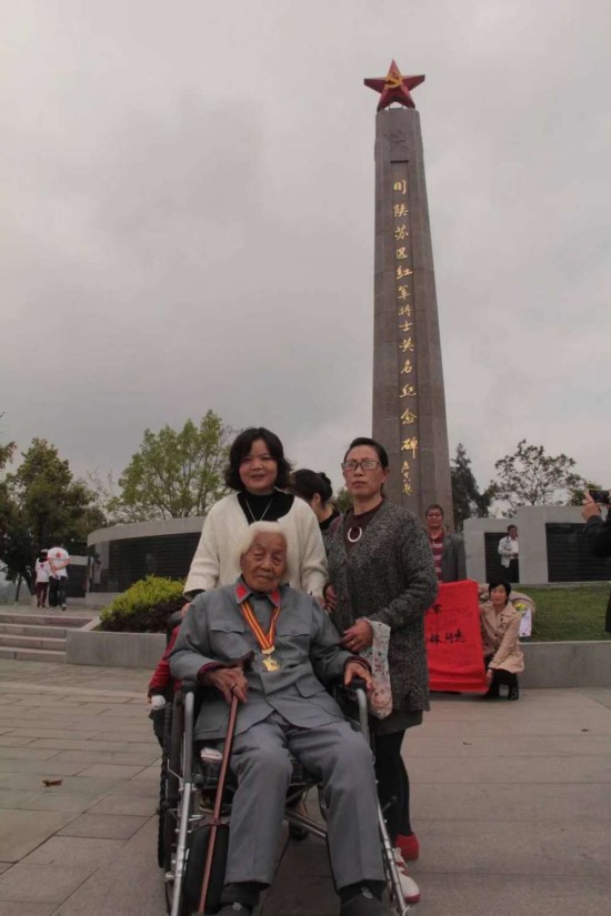 2017年,牟炳贞(前)来到巴中将帅碑林缅怀战友