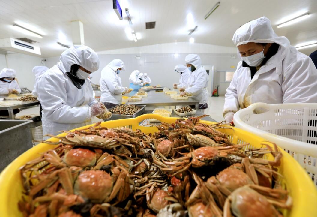 当日下午,在宿迁宴王食品有限公司生产车间内,部分复工的工人们正仔细地将蟹黄和蟹肉从煮熟的螃蟹中分离、剔出。该公司主要生产蟹黄酱,每天能消耗1500公斤的螃蟹,再加上有港台和日本市场的订单保障,所以销路不愁。