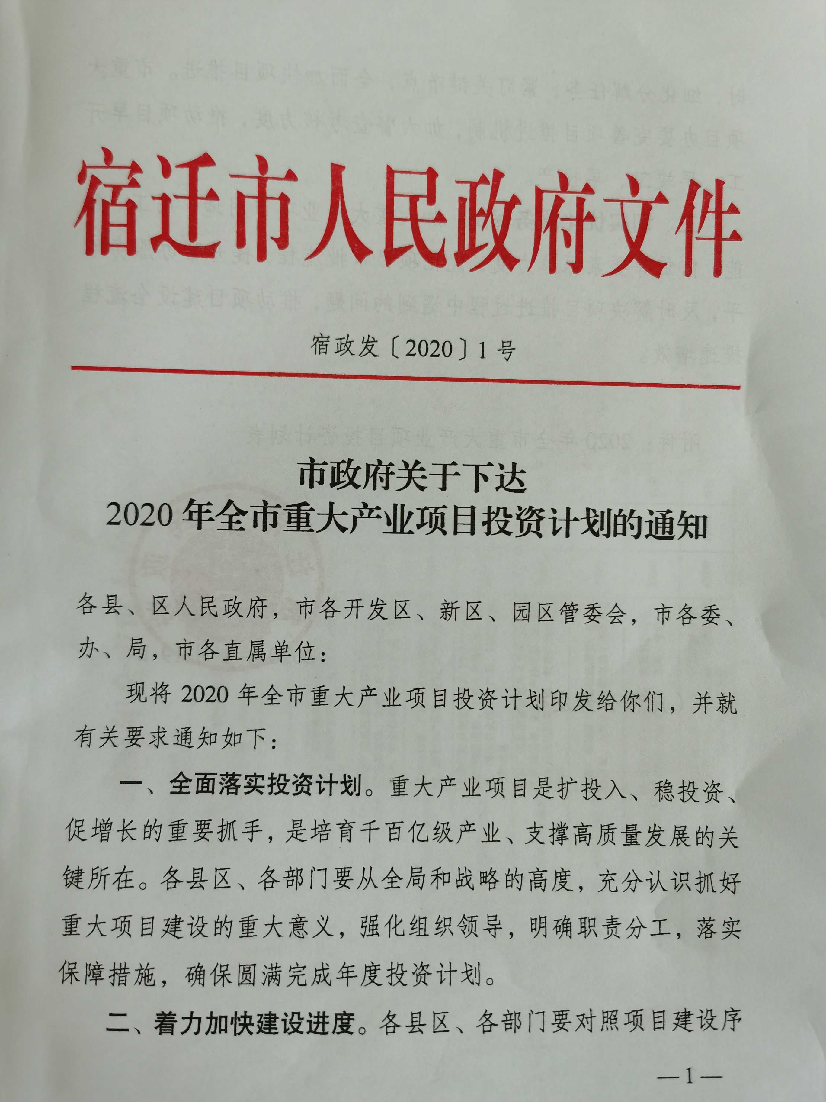 重大产业项目是扩投入、稳投资、促增长的重要抓手,是培育千百亿级产业、支撑高质量发展的关键所在。近日,宿迁市政府下达2020年全市重大产业项目投资计划,今年计划实施市级重大产业项目273个,计划总投资3557.3亿元,年度计划投资1583.5亿元。