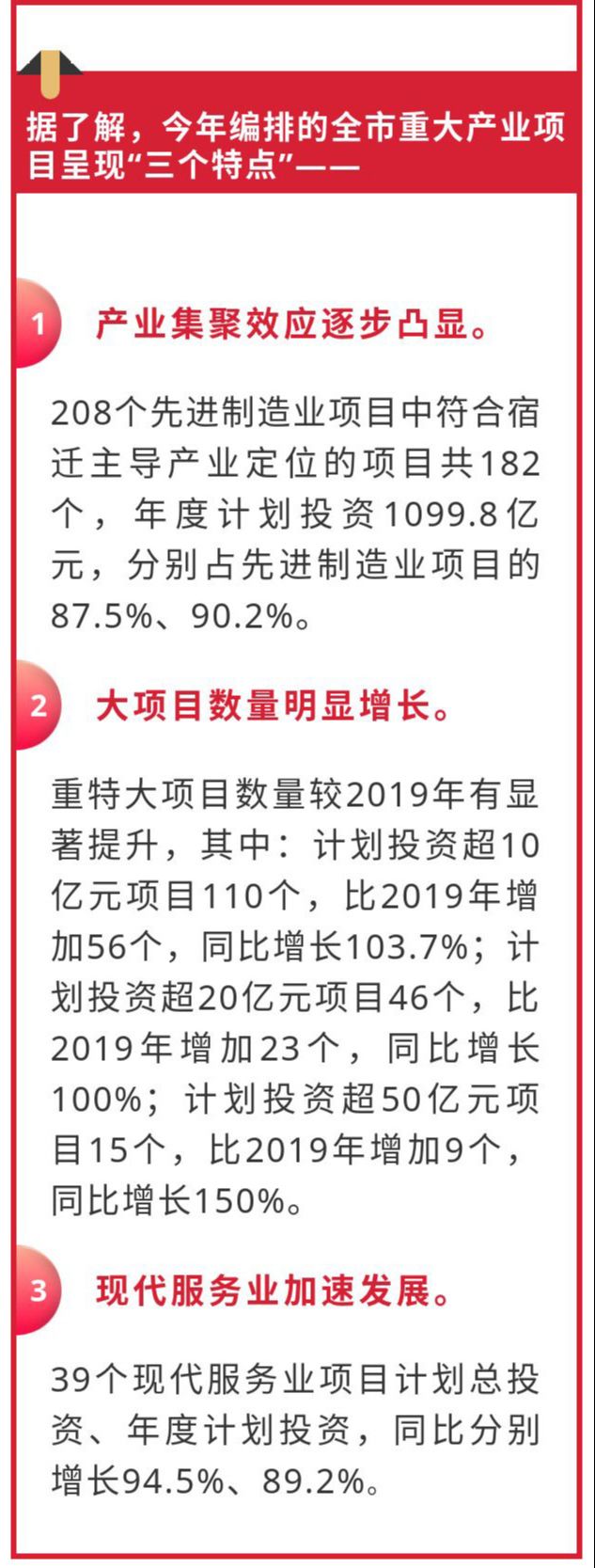 为确保完成年度投资计划,顺利推进重大产业项目,宿迁要求各地、各部门对照项目建设序时,细化分解任务,紧盯关键节点,优化服务保障,全力推动项目建设全流程提速增效,实现早开工、早竣工、早投产、早达效。