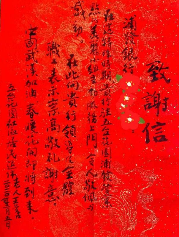 当老人看到手机短信提醒的时候,连连表示感谢。第二天,他还手书了一封感谢信托人送到五台社区支行,他说,在这特殊时期,服务上门,令人敬佩感动。在向浦发人表示谢意的同时,他也写下,“春暖花开即将到来”。