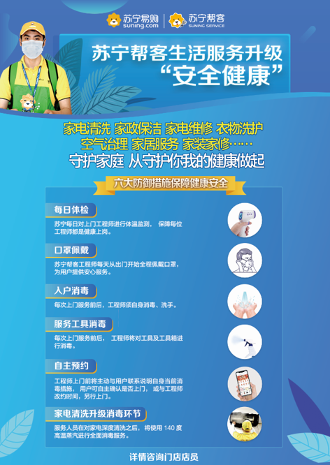 对于上门服务的帮客工程师,南京苏宁坚持六大防御措施保障健康安全。除了日常的体温监测与口罩佩戴以外,工程师将在上门服务的前后均经过自身消毒与洗手,且随身服务工具与工具箱也将进行全面的清洁杀菌。同时,为了进一步便利用户,工程师上门前将主动联系用户说明当前消毒措施与身体状况,用户可自主确认是否上门,或可更改预约时间,另行上门。此外,对于日常的家电深度清洗服务,工程师也将在清洗流程结束后使用140度高温蒸汽对其进行全面的消毒服务。