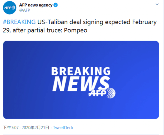 【环球网快讯】据法新社刚刚消息,美国国务卿蓬佩奥透露,美国与阿富汗塔利班预计将于2月29日签署(和平)协议。