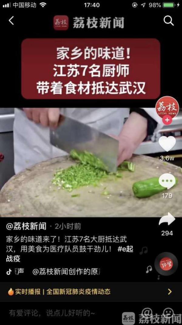 正当大家疑惑,是不是我们江苏厨师来了?在武汉洪山区方舱医院的王蕾给我发来一张截图:截图上写着“家乡的味道,江苏7名厨师,带着食材抵达武汉”。一瞬间,我的眼泪就流了下来,那感觉就像是父母不远千里,赶来给我做了一顿饭菜。作为江苏人,那一刻,除了感动,就是自豪!