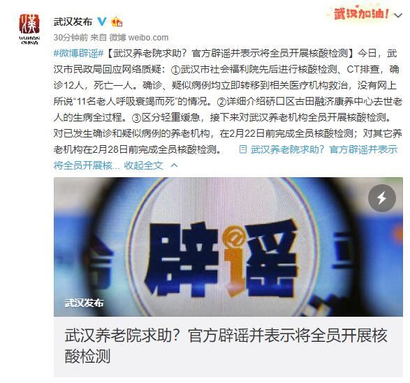 荔枝新闻讯 据武汉发布消息,武汉市民政局就“网传武汉养老院求助”等回应质疑:①武汉市社会福利院先后进行核酸检测、CT排查,确诊12人,死亡一人。确诊、疑似病例均立即转移到相关医疗机构救治,没有网上所说“11名老人呼吸衰竭而死”的情况。②详细介绍硚口区古田融济康养中心去世老人的生病全过程。③区分轻重缓急,接下来对武汉养老机构全员开展核酸检测。对已发生确诊和疑似病例的养老机构,在2月22日前完成全员核酸检测;对其它养老机构在2月28日前完成全员核酸检测。
