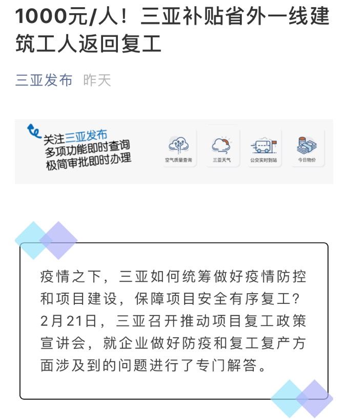 在政策保障方面,三亚出台了《关于在疫情期间支持建设项目安全有序复工的措施》《三亚市应对新冠肺炎疫情保障项目建设的政策措施》《新冠肺炎疫情期间建设项目工地开工复工工作指南》等扶持政策。其中有多项硬核措施,如投资1亿元以上的固定资产投资在建项目,省外一线建筑工人2月返回复工,市财政按每人1000元给予补贴;离岛返工人员抵达三亚后由项目所在地区政府组织安排医学观察,由卫生健康部门组织进行新冠病毒肺炎医学检测;支持项目先行建设,已签订土地出让合同的项目在缴纳完不低于60%土地出让金的情况下,可持相关缴款单据先行办理《建设工程规划许可证》和《建设工程施工许可证》……一条条有力的政策措施,推动各行各业迅速复工复产。