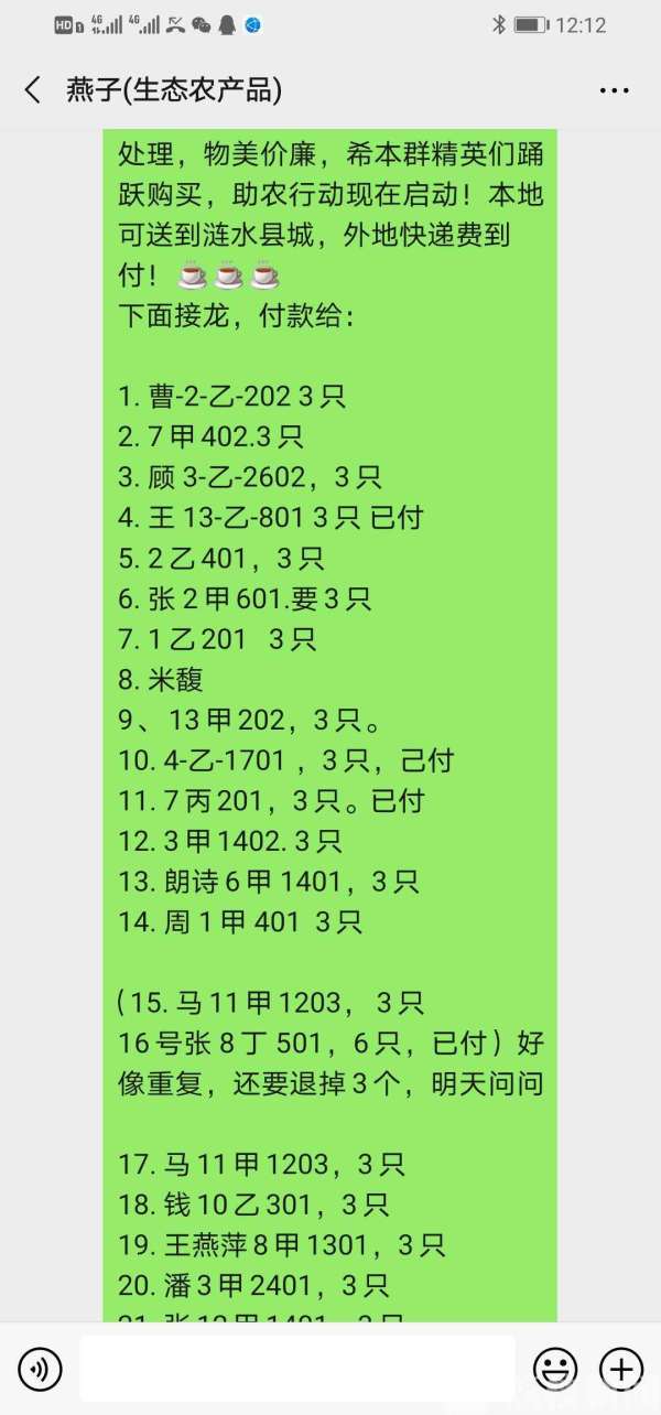 2月15日,涟水县召开的疫情防控期间农业生产座谈会上,左磊如实说出了自己的困境。“有难处,大家帮!”分管农业的县委常委、宣传部部长姜杰当场要求农业农村局等单位帮助搭建销售平台,并让左磊换个思路,屠宰加工“淘汰鸡”,减少中间环节搞“直销”,在“朋友圈”里找市场。说干就干!当天中午,销售信息在“涟水菜篮子产品产销对接群”及一些微信客户端发布出来,左磊也在自己的微信群、朋友圈、QQ群上向外转发,众多网友纷纷预订。第二天早上,左磊添置脱毛机烫锅,开足马力加班生产,还组织了三辆车专门送货。“真没想到,非常时期,非常之策还就管用,要货的络绎不绝!”他按每只25元把加工好的鸡送货上门,来公司提货则便宜一些,销售的“朋友圈”越扩越大,该淘汰的蛋鸡一只只在减少。