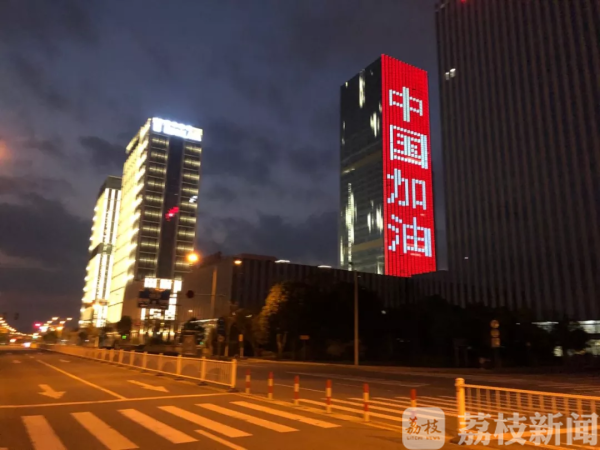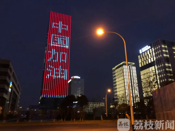 2月22日,夜幕降临,华灯初上。无锡经开区多个楼宇灯光滚动,播放“武汉加油!中国加油”字幕,夜幕中的“中国红”,格外醒目。