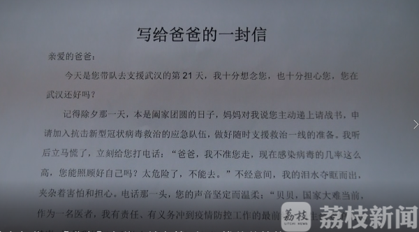 “记得除夕那一天,本是阖家团圆的日子,妈妈对我说您主动递上请战书,申请加入抗击新型冠状病毒救治的应急队伍。外婆听说了这个消息泪水涟涟,我听后也慌了,立即给您打电话。电话那一头,您的声音坚定而温柔:‘贝贝,国家大难当前,你要相信,爸爸心中有着对你们的牵挂,一定会平安归来!’”——《写给爸爸的一封信》