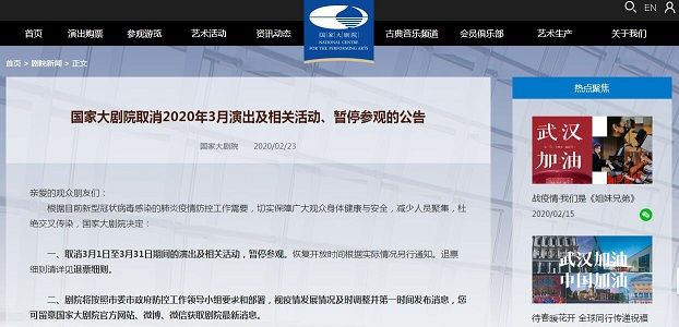 国家大剧院取消2020年3月演出及相关活动、暂停参观的公告