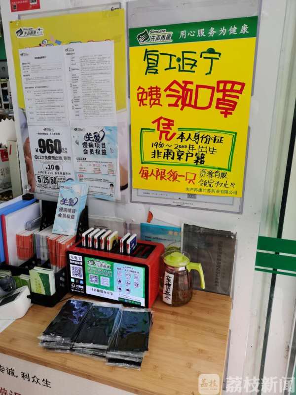 2月23日上午,记者在南京丹凤街的这家先声再康药店看到,店里已经打出了酒精到货、复工返宁人员免费领口罩的广告。凡是1960年到2000年出生的复工返回南京的人员,凭非南京籍身份证,每人可以免费领取一个口罩。由于丹凤街这家药店不是政府定点的口罩销售点,可供销售的口罩依然缺货,但酒精等消毒产品供应充足。