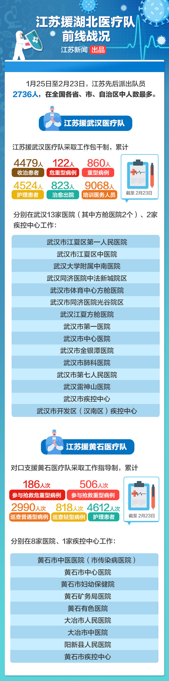 江苏派出援湖北医疗人员全国最多!1月25日至2月23日,江苏先后派出2736名医疗人员支援湖北。在武汉,江苏医疗队累计收治患者4479人,护理患者4524人,累计治愈出院人数823人,累计培训省内及武汉医务人员9068人…在对口支援的黄石,江苏医疗队累计参与抢救危重型病例186人次、重型病例506人次,参与护理4612人次…每个数字背后,都是江苏医疗队不分昼夜、不计生死、不负使命的奋战,千言万语,唯有致敬!盼平安归来!