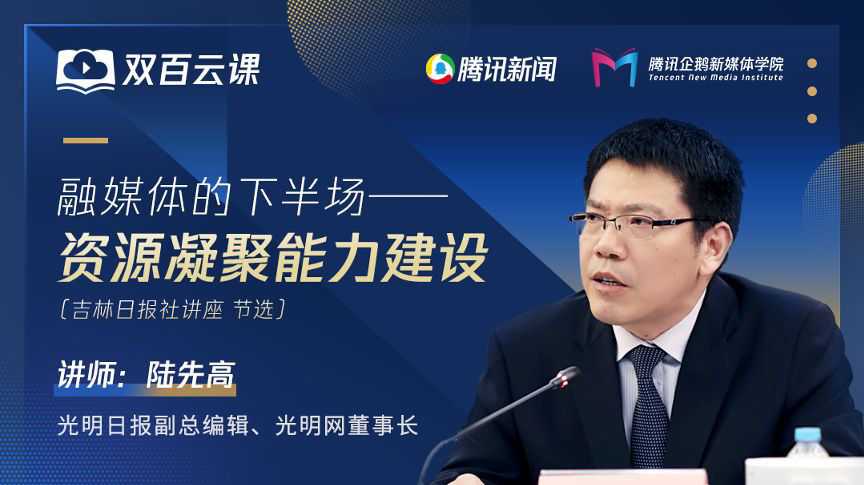 “双百云课”线上公益课程已于2月24日在腾讯新闻、腾讯课堂同步上线,首堂课就是由光明日报副总编辑、光明网董事长陆先高带来的《融媒体的下半场——资源凝聚能力建设》,课程高屋建瓴的从多个方面详细分析中国融媒体的现状,以及如何能够有效的配置资源,做好做强融媒体的能力建设,结合最新案例和多年经验让人豁然开朗。