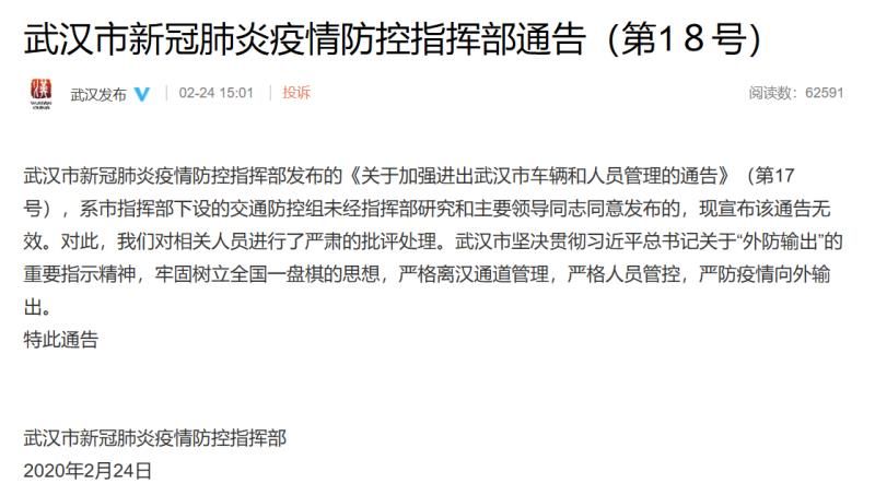 荔枝新闻讯 24日下午15点01分,“武汉发布”官方账号发布一条消息称,此前武汉市新冠肺炎疫情防控指挥部发布的《关于加强进岀武汉市车輛和人员管理的通告》(第17号),系市指挥部下设的交通防控组末经指挥部研究和主要领导同志同意发布的,现宣布该通告无效。目前已对相关人员进行了严肃的批评处理。武汉市坚决贯彻习近平总书记关于外防输出"的重要指示精神,牢固树立全国一盘棋的思想,严格离汉通道管理,严格人员管控,严防疫情向外输出。