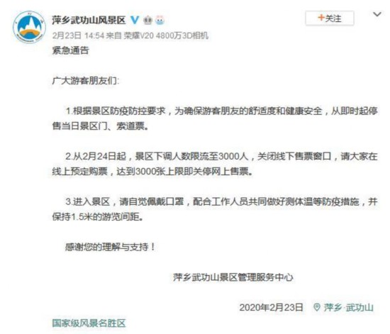 荔枝新闻讯 江西萍乡武功山风景区官方微博今日发布紧急通告称,从24日起,景区下调人数限流至3000人,关闭线下售票窗口,请游客在线上预定购票,达到3000张上限即关停网上售票。
