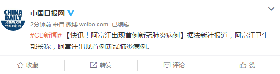 据法新社报道,阿富汗卫生部长称,阿富汗出现首例新冠肺炎病例。