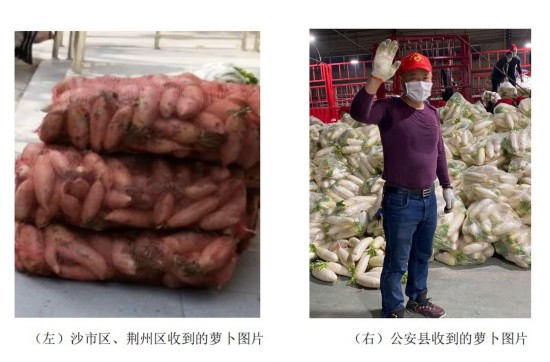 据两个区接收物资时发来的图片,我市收到的萝卜与视频中萝卜品类及分装均有不同。另一批为公安县收到四川峨眉山爱心人士捐赠的萝卜36吨,与视频中萝卜品类及分装也不同。