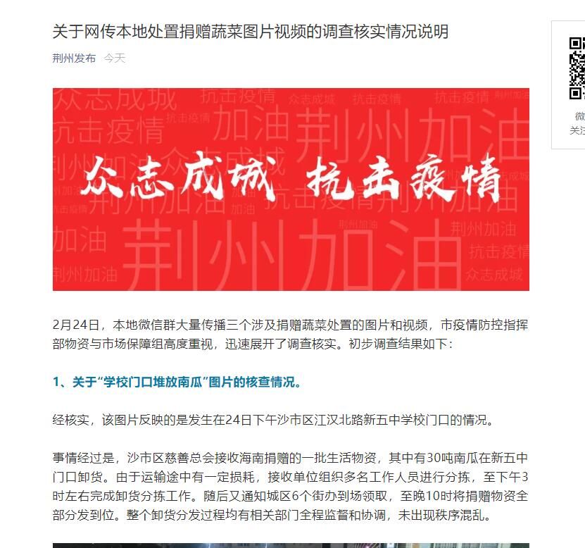 荔枝新闻讯 荆州市人民政府新闻办公室官方微信“荆州发布”25日发布荆州市新冠肺炎防控指挥部物资与市场保障组《关于网传本地处置捐赠蔬菜图片视频的调查核实情况说明》一文,说明当地微信群大量传播的三个涉及捐赠蔬菜处置的图片和视频。以下为情况说明全文:
