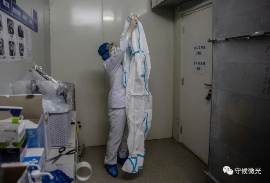 2月21日,武汉火神山医院感染八科,一名医护人员准备穿上防护服进入病区。为了防止污染,防护服不能着地,穿着过程中需时刻注意。中青报·中青网记者 李峥苨/摄