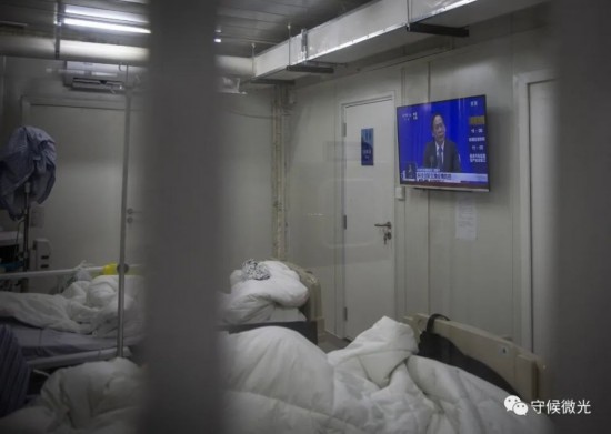 2月21日,武汉火神山医院感染八科,新冠肺炎患者在病房内的电视上收看当天在北京举办的国务院联防联控机制新闻发布会直播。中青报·中青网记者 李峥苨/摄