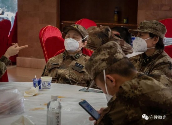 午餐时,几个医护人员坐在餐桌前打盹,这是他们繁忙工作中少有的可以坐下休息的时间。左卉川说,她和同事们有时需要在防护服中连续工作六七个小时,工作开展的初期,每天只能睡两三个小时。