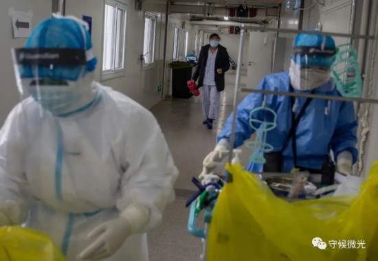 2月21日,武汉火神山医院感染八科,护士正收集患者的动脉血样,准备移交检验科,身后一名患者拎着热水壶走过。中青报·中青网记者 李峥苨/摄