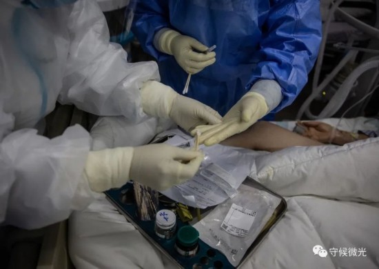 2月21日,武汉火神山医院感染八科一区,医护人员准备为一名新冠肺炎患者采动脉血样做血气分析。中青报·中青网记者 李峥苨/摄