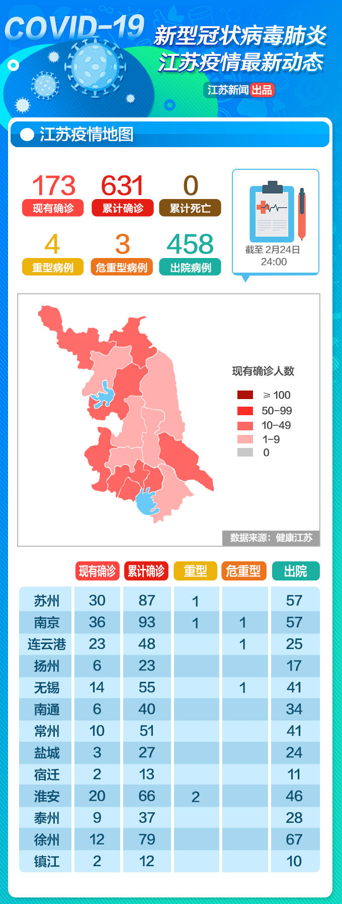 截至2月24日24时,江苏省累计报告新型冠状病毒肺炎确诊病例631例。其中,南京市93例、无锡市55例、徐州市79例、常州市51例、苏州市87例、南通市40例、连云港市48例、淮安市66例、盐城市27例、扬州市23例、镇江市12例、泰州市37例、宿迁市13例。