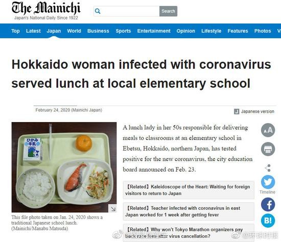 据日本每日新闻社报道,日本北海道江别一所小学的配餐员,于本月23日被确诊感染了新冠病毒。报道称,这名50多岁的女性雇员主要负责将食物配送给小学二年级和四年级的教室,这些教室共有194名学生。她是在2月13日出现的症状,但仍然坚持上班,直到2月15日才去看了医生。不过,报道称她在工作中会佩戴面罩,手套和白大褂。校方在得知此事后曾暂时停课并给校园消毒,后于今天复课。该女子的同事则被要求回家隔离。报道还称,目前没有学生感到不适。截至2月24日,北海道共有30人感染。